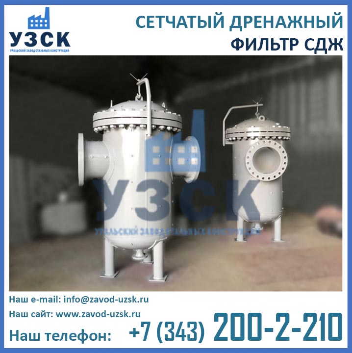 На формирование цены дренажного фильтра влияют следующие факторы: материальное исполнение, конструктивное исполнение, стоимость сырья в момент изготовления, комплектация, необходимость доставки в другой населенный пункт, срочность выполнения работ по изготовлению, прочие предпочтения заказчика. Уральский завод стальных конструкций изготавливает фильтры СДЖ-700 любого типового исполнения, а также нестандартные фильтры СДЖ 700 мм по чертежам заказчика или техническому заданию. Дополнительно к фильтрам СДЖ у нас Вы можете заказать сменные фильтрующие элементы любой тонкости фильтрации, ответные фланцы, прокладки и крепеж. По запросу изготавливаем также фильтры СДЖ-К-700 с концевым затвором. Для того чтобы узнать какова цена на фильтр СДЖ Ду700 в Красноярске с необходимыми Вам характеристиками, отправьте запрос в отдел продаж завода УЗСК по координатам, указанным в разделе «Контакты».