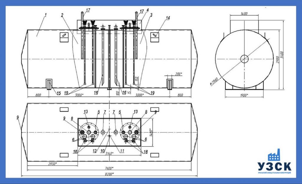 Основные характеристики резервуара – его объем, толщина стенок и геометрические размеры. Однако каждый резервуар, изготовленный по договору, соответствует требованиям эксплуатации. Так, некоторые из баков выполнены с подогревом. В других устроена лестница и площадка обслуживания. Иногда по требованию заказчика производитель устанавливает раздаточную колонку, в других, выполняется обвязочная схема резервуара с насосами и вентилями.